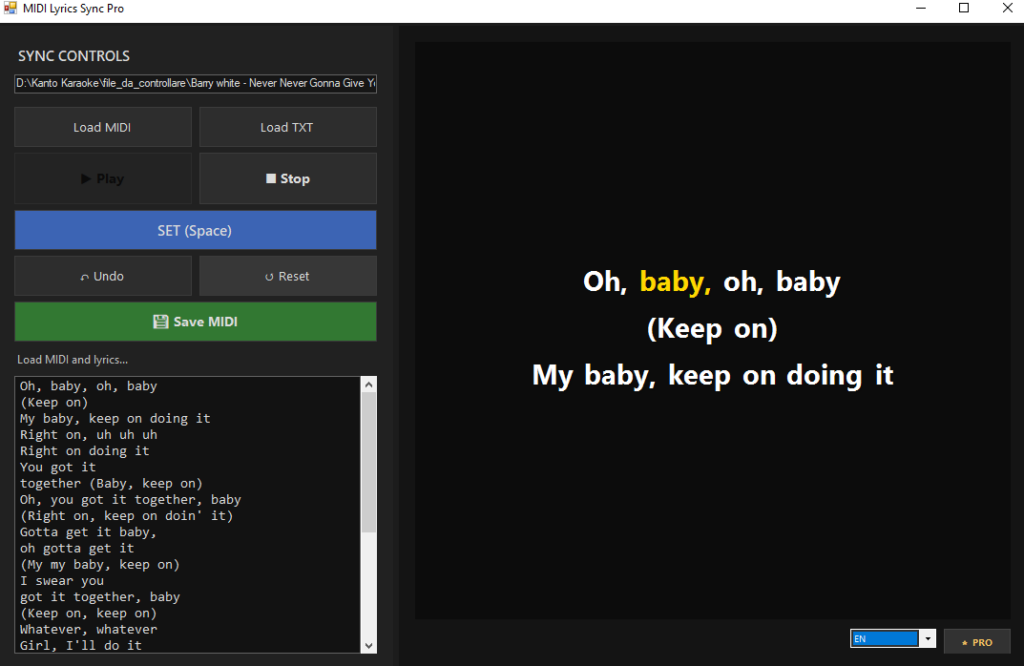 While the MIDI plays, press SET (or the Space key) on each word exactly when it should be highlighted.